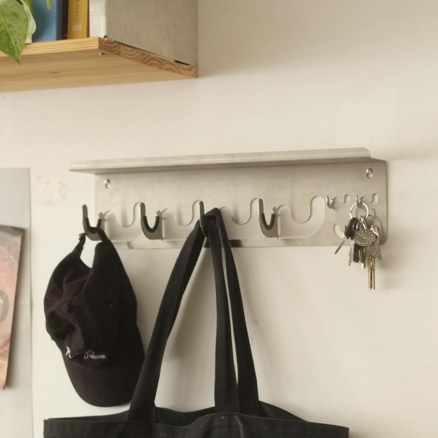 Wall organizer designed for @lichennyc. Heavy duty version of the hangi.tutti. This one is intended to hold heavier everyday carry items like bags, coats, umbrellas, dog leash as well as small loose pocket items on the shelf like wallet, glasses etc.